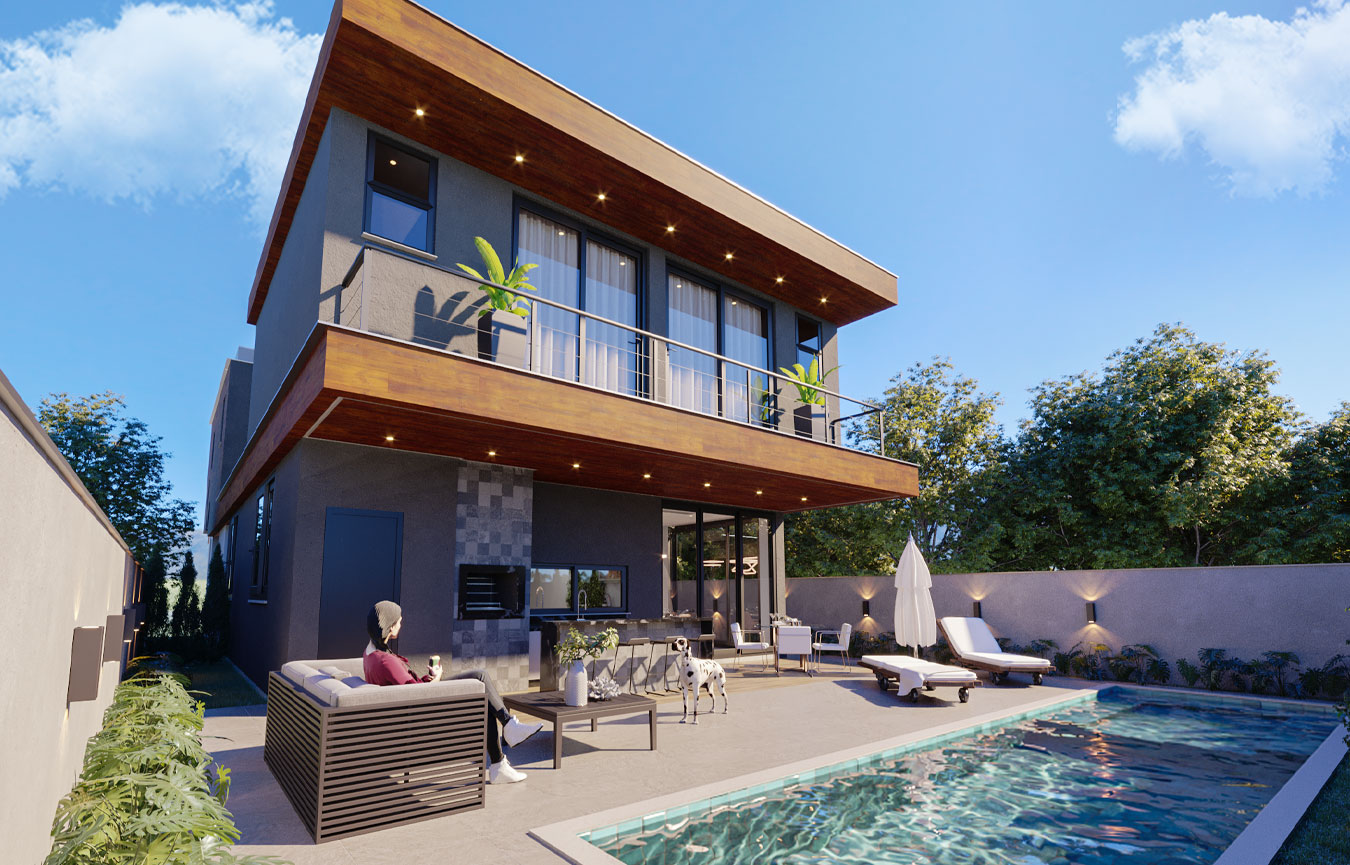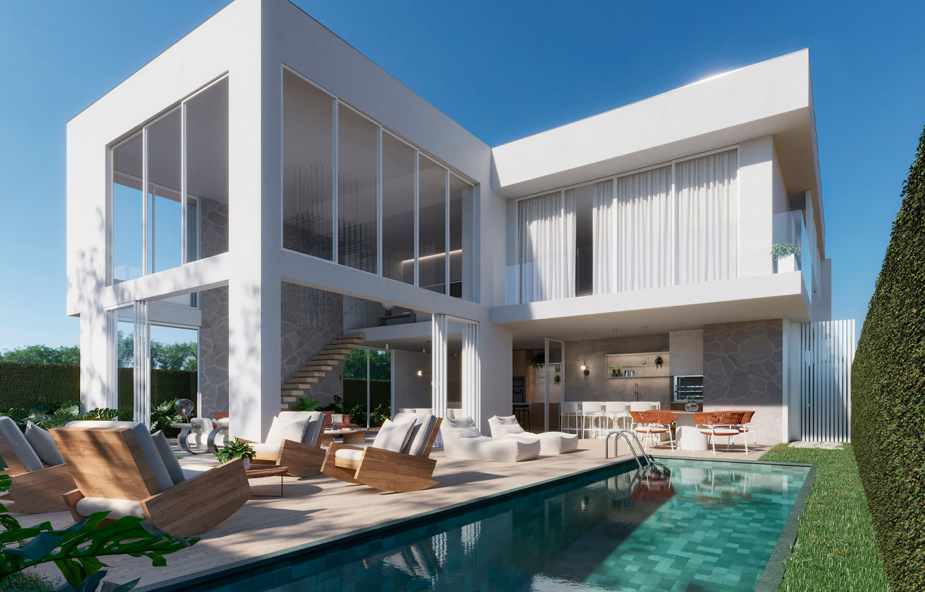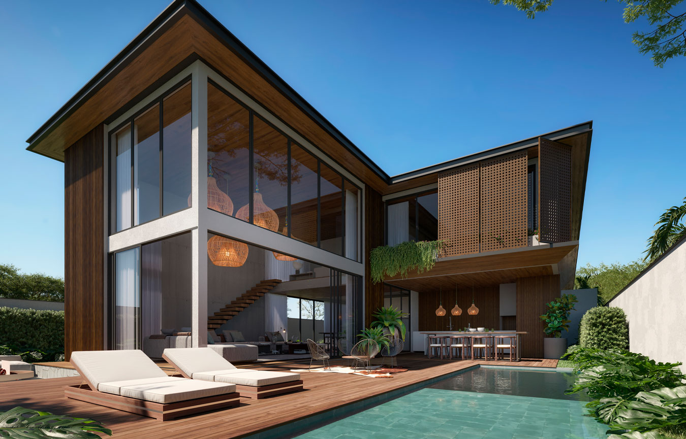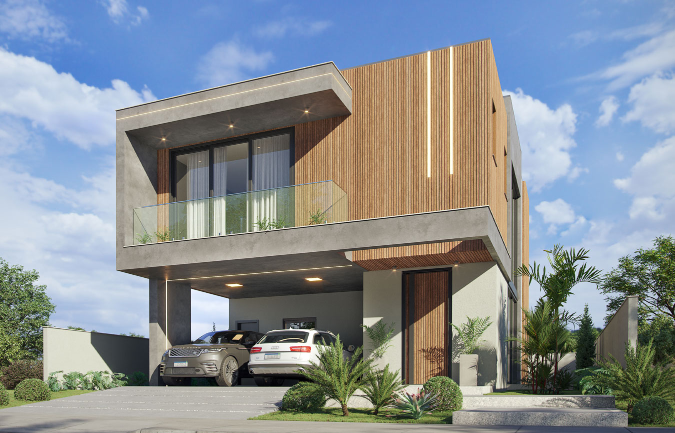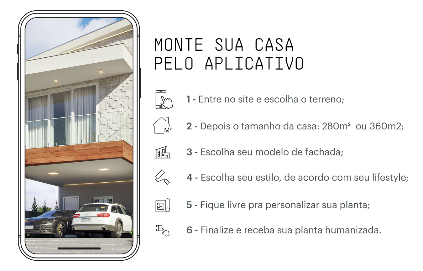 Opções de casas personalizáveis de 250 m² a 650 m², com design exclusivo inspirado pela natureza. Sua casa planejada da planta ao acabamento, usando materiais sustentáveis e inteligentes.